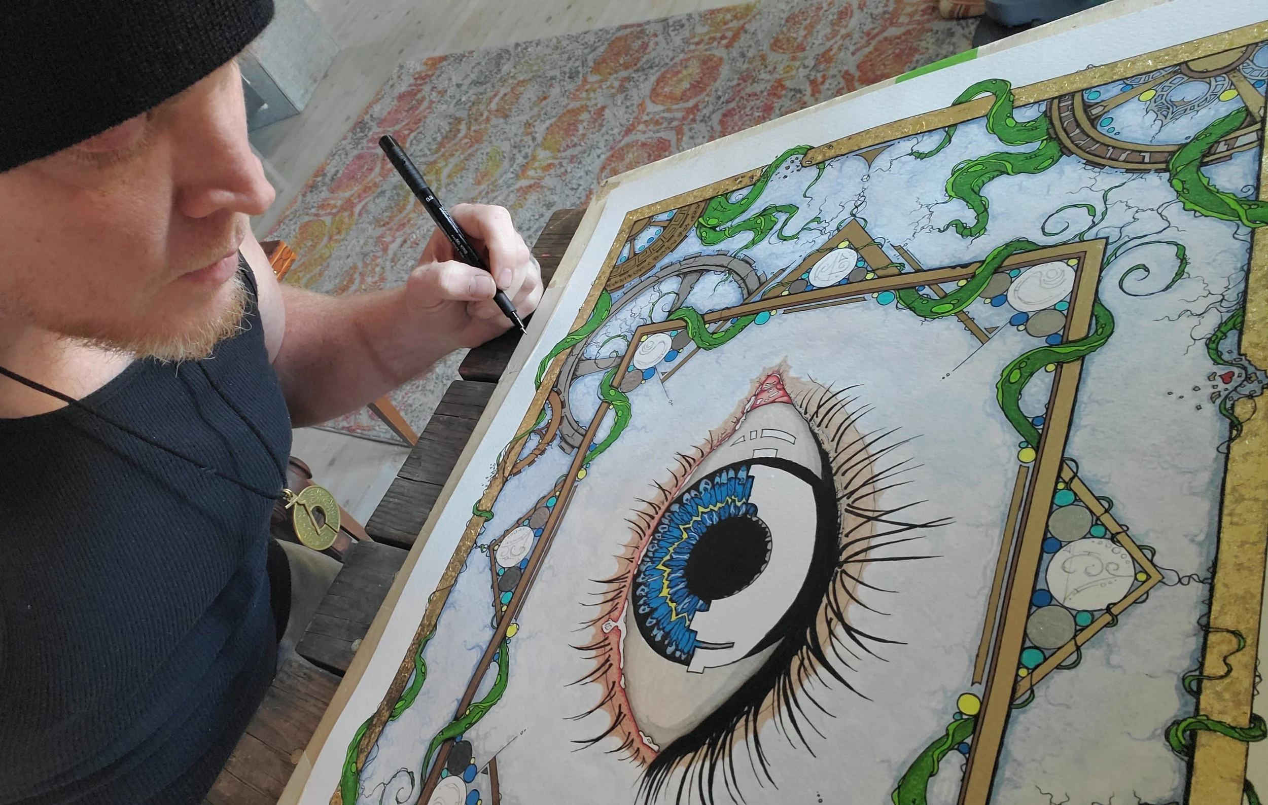 An Original Image on Watercolor Paper using Genuine Lapis Lazuli watercolor paint, Prima pencils and markers, Gold leaf and silver and gold metallic paint.